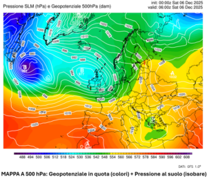 La situazione in Italia è bipartita: condizioni in netto miglioramento e stabili con ampie schiarite sui settori occidentali (Sardegna, Nord-Ovest) grazie all’alta pressione atlantica; e persistenza di instabilità con piogge e venti moderati (con possibili raffiche sulla costa pugliese) sui settori orientali del Sud a causa del vortice ciclonico mediterraneo in allontanamento. L’Europa del Nord rimane sotto maltempo a causa del ciclone Atlantico ancora attivo.