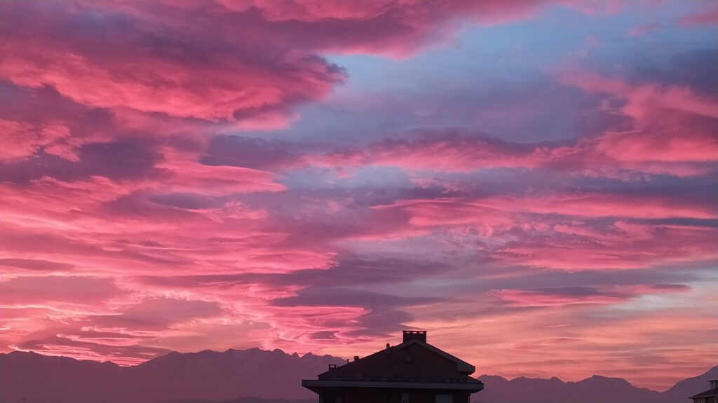 Spettacolare formazione di Altocumulus che al tramonto o all’alba si tingono di colori rosati o rossastri o arancio dando al cielo un aspetto fiabesco. Sono stati osservati anche questi come le tre foto precedenti al calare del sole però. Sempre molto alti ( 6000 metri) e indice di forti venti in quota perpendicolari alle Alpi.